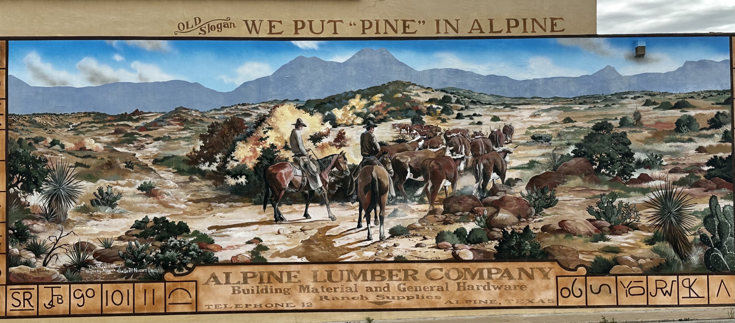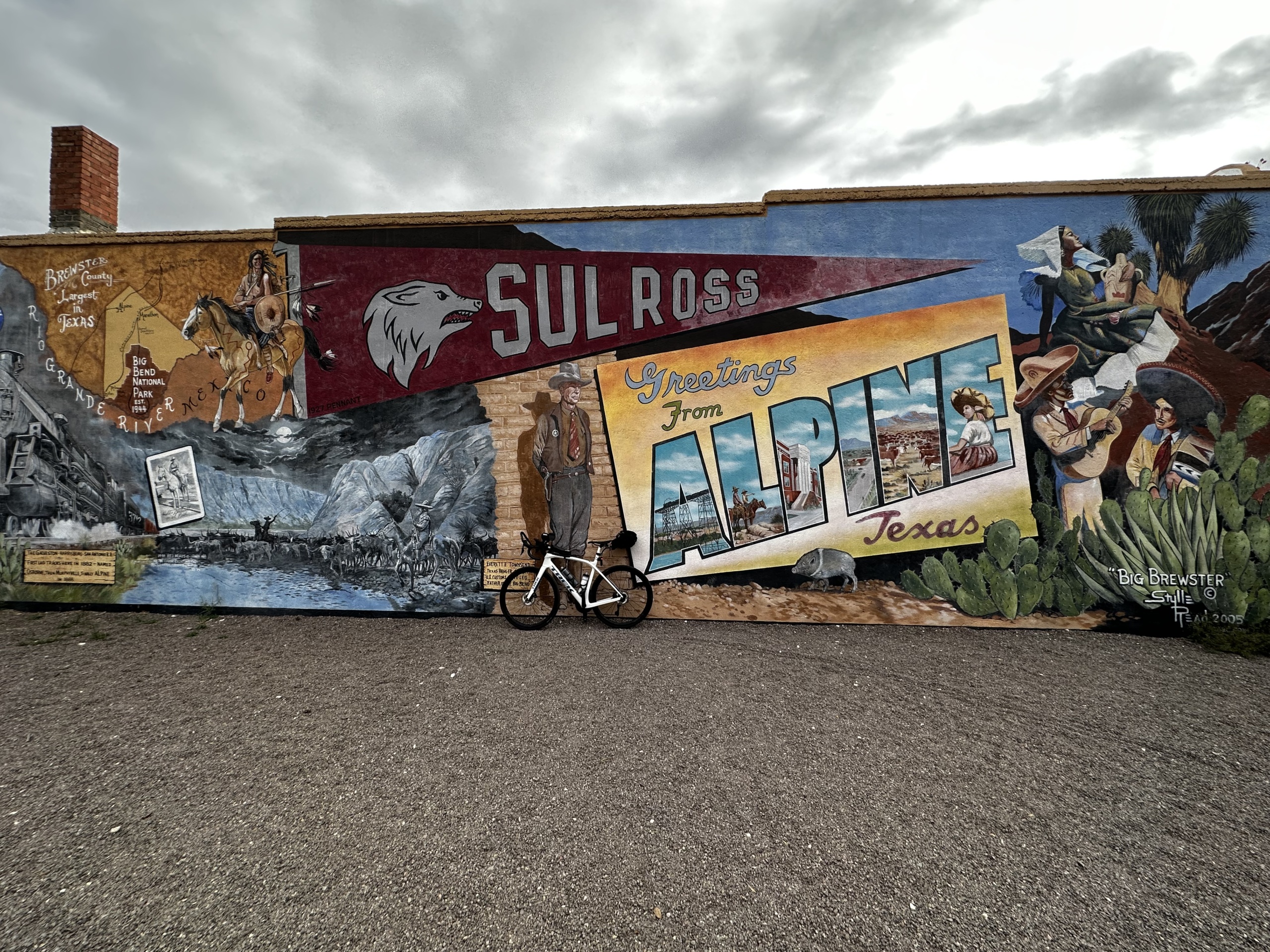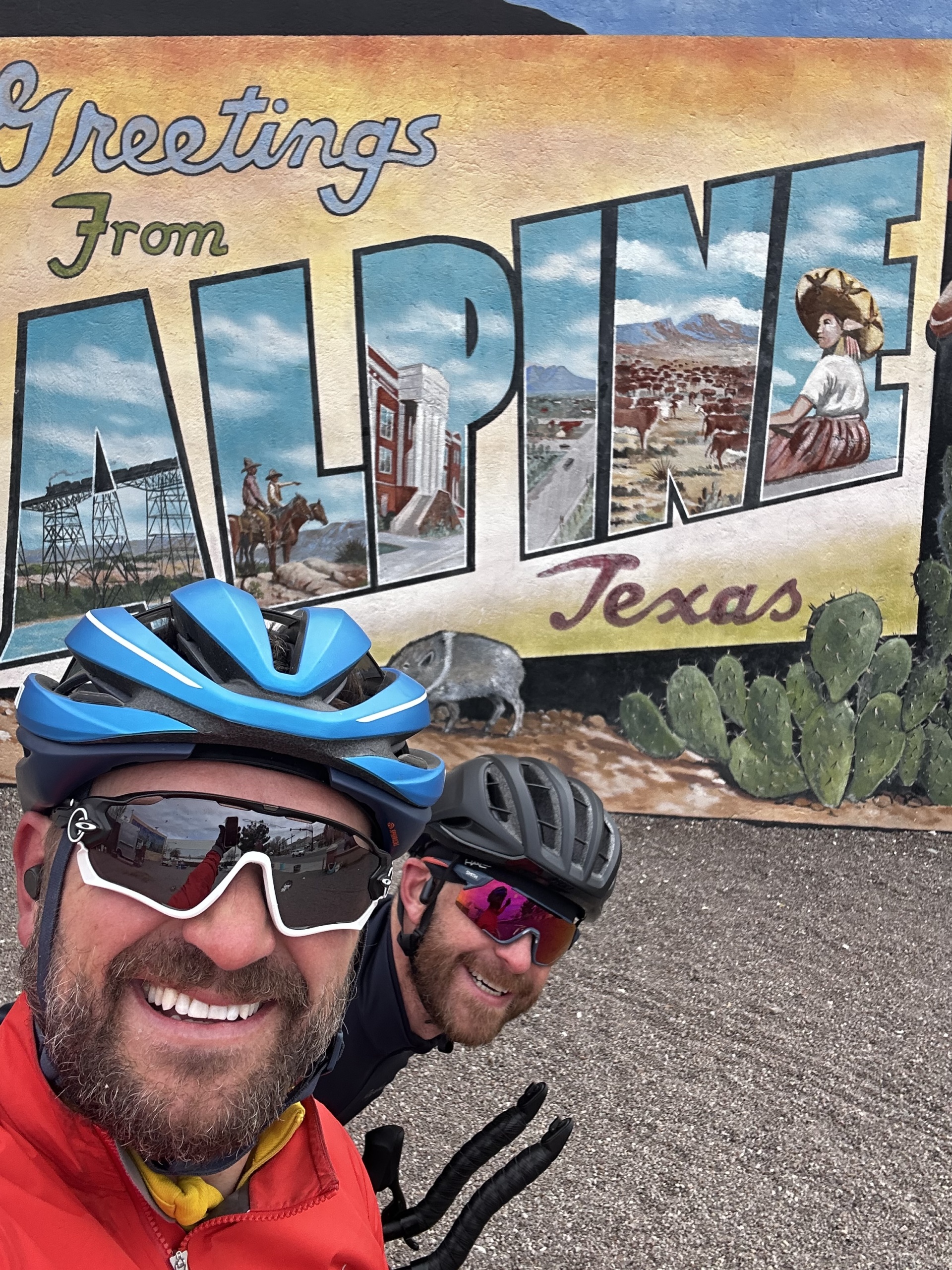 Despite the conditions, we pushed on, determined to make it to our destination. We took a break in Alpine, Texas (the halfway point) and had lunch with Tom and Rick. Alpine was another cool artsy town with plenty of murals.