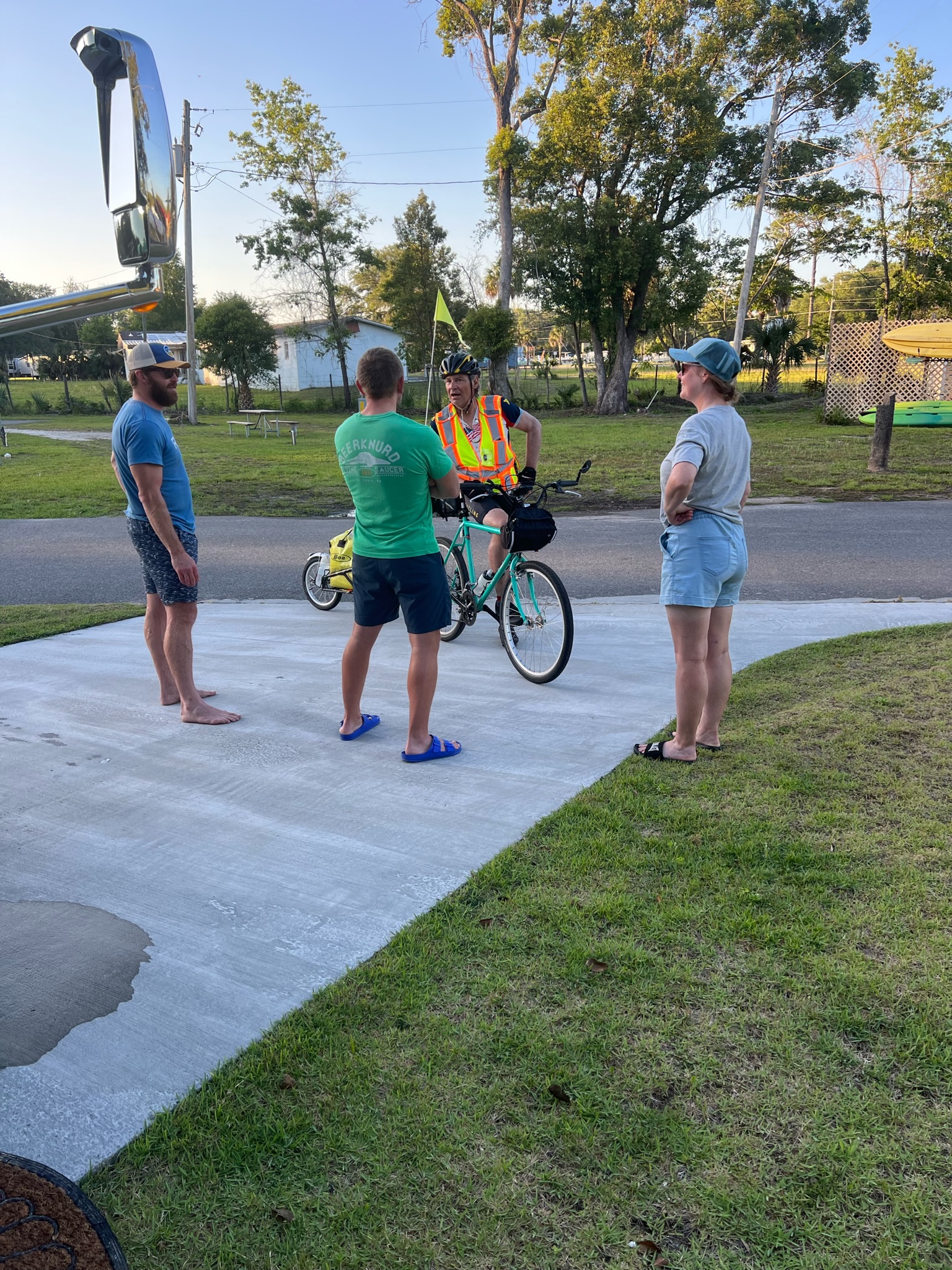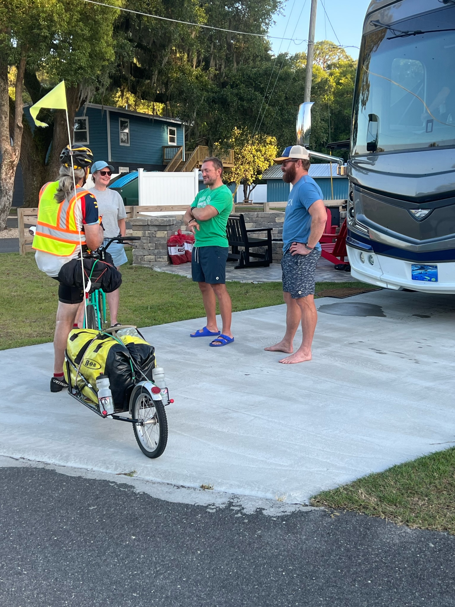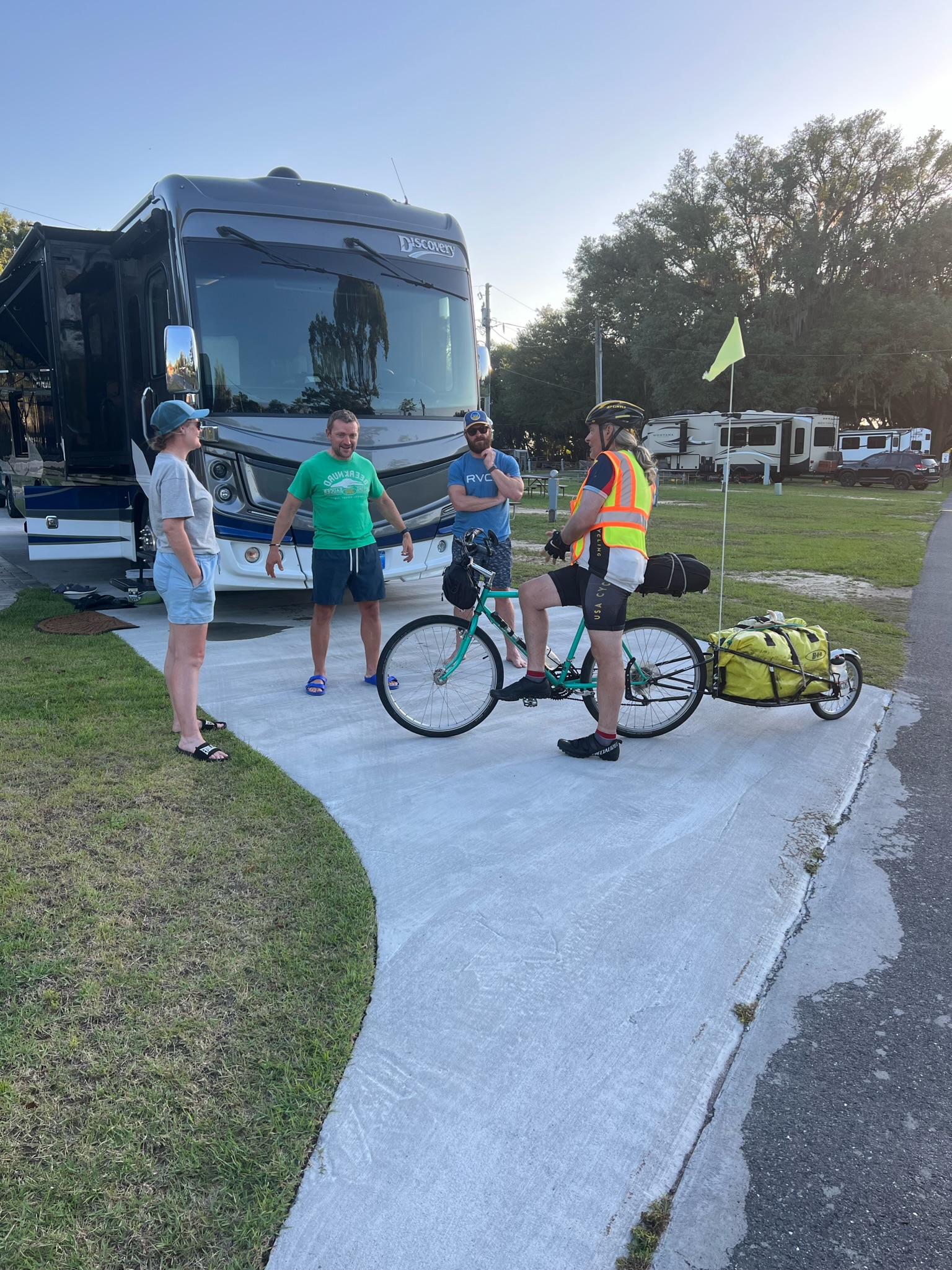 After dinner, two other cyclists pulled into the RV Park because they were camping there in tents. One of them was Wendell, who Dave and I ran into almost 30 days ago in Brackettville, Texas at Ziggy’s BBQ. The other was Jaime who we hadn’t seen before, but based on our Strava feeds, we were constantly passing each other like ships in the night. What a small world that we all convened on the same RV park on the same night even though we all left at different times with different routes and different stops. We all hung out for a while before they retired for bed. Both of them planned much more mileage the next day than us, and they like us, are eager to finish.